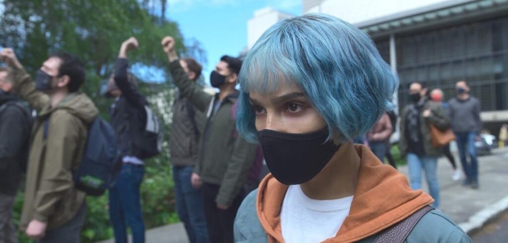 Vi møter Zoë Kravitz som Angela – en yngre kvinne som tydelig sliter med en angstlidelse som hindrer henne i å forlate leiligheten og være fysisk rundt andre mennesker. Det er en lidelse som muligens har blitt forsterket av pandemi-situasjonen som er organisk innlemmet som en del av fiksjonen (og som sannsynligvis har vært en ytre katalysator for selve filmskapelsen). Angela oppholder seg 24 timer i døgnet i leiligheten, hvor menneskekontakt er begrenset til digital kommunikasjon, og blikk mot nabovinduer som tidlig indikerer en «Rear Window»-retning som ikke følges opp, i hvert fall ikke i tradisjonell forstand. Angela jobber hjemmefra som en såkalt stemmestrømtolk for et mektig selskap bak en fiktiv stemmeassistent, Kimi, med paralleller til virkelighetens Siri og Alexa. Under arbeid overhører hun et lydopptak som hun umiddelbart reagerer på, og som hun gjennom å analysere lyden avdekker at skjuler et sannsynlig drap. Dette øyeblikket fanges på fantastisk vis med en sterk iscenesettelse som ikke kan ses som annet enn en homage til John Travoltas lydgranskning i Brian De Palmas «Blow Out» (som igjen var inspirert av Francis Ford Coppolas «The Conversation» og Michelangelo Antonionis «Blow-up»). Angela blir naturligvis forferdet og rystet over oppdagelsen, men når hun flagger den alarmerende hendelsen oppover i systemet så kommer det med en urolig følelse av at noe ikke helt stemmer.