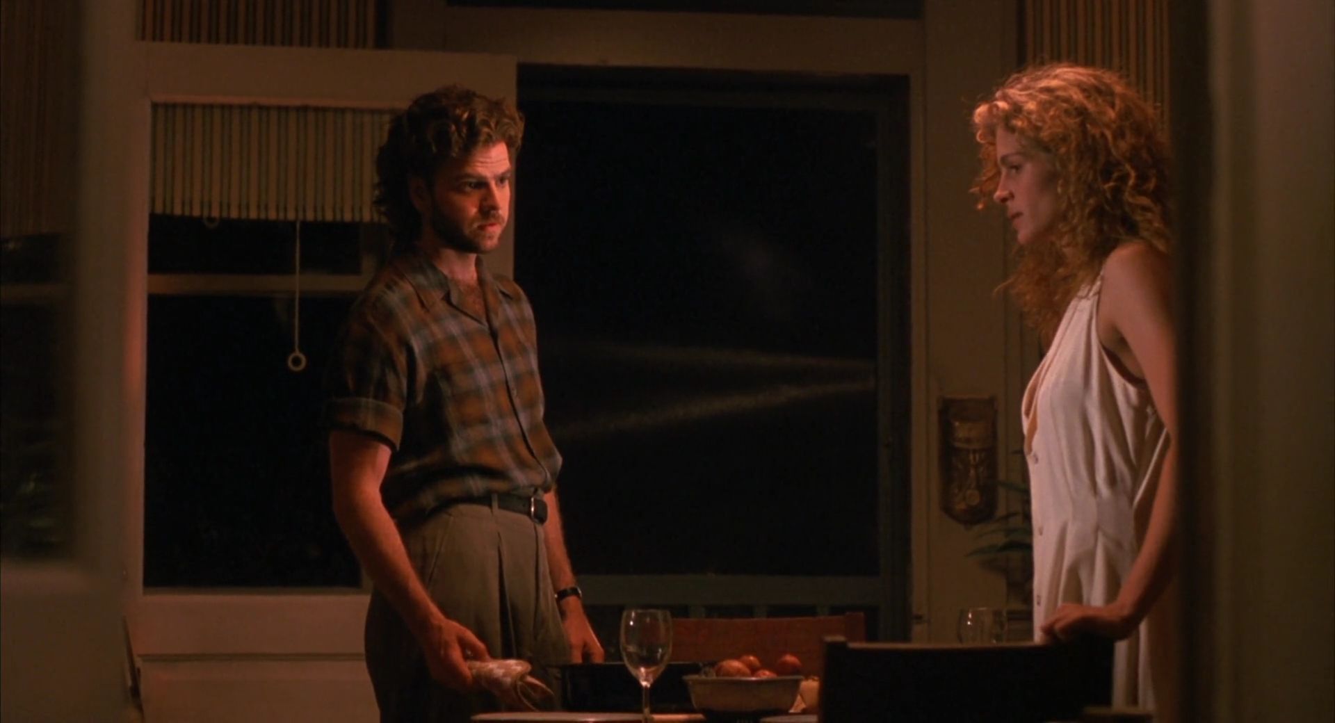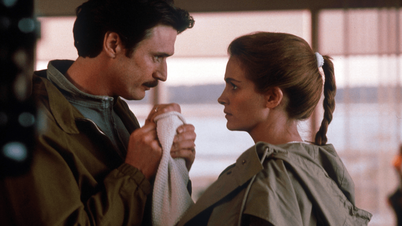 Den konkrete telefonoppringningen som er startskuddet for psykopatmannens mistanke om at kona likevel kan være i live og har rømt fra ham, er ett av flere eksempler på lettvinte manusvalg det er vanskelig å forstå fremstod som beste idé for å føre handlingen videre. Ikke bare er «Sleeping with the Enemy» tidvis uoriginal i hvordan den flytter historien fremover, den har noen konkrete handlingspunkter som virkelig rimer dårlig med hva man kan tro på. Disse lettkjøpte dramatiske vendingene var definitivt også et bærende element i regissør Joseh Rubens farlig underholdende 80-tallsthriller, «The Stepfather», også den med en psykopatmann – spilt av Terry O’Quinn – i begivenhetens sentrum. Denne filmen, inkludert figurportretteringen, er langt mer lavmælt, selv om Patrick Bergin helt tydelig tenderer mot det karikerte – dog uten samme karisma som nevnte O’Quinn. Mens «The Stepfather» handlet mye om iscenesettelsen av psykopatien i O’Quinns ofte ekstravagante spill, er «Sleeping with the Enemy» psykologisk siktet mot det hverdagslige i skapelsen av skrekk. I denne settingen er Julia Roberts filmens trumfkort – ikke bare fordi hun trakk publikum til kino grunnet sin nyvunnede stjernestatus, men fordi hun rent faktisk skaper et overraskende troverdig bilde av en sårbar, ung kvinne eksponert for psykisk og fysisk misbruk i et forhold, som spiller ut denne frykten på subtilt vis uten store fakter og utbrudd, der smerten og den indre uroen likevel uttrykkes på tidvis hjerteskjærende måte. Det er gjennom hennes skjebne at «Sleeping with the Enemy» blir merkbart engasjerende.