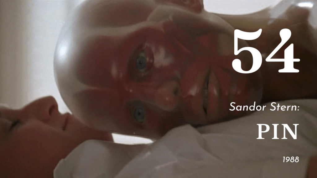 Dette lille kanadiske psykologiske-skrekkfilm-dramaet, som er skrevet og regissert av Sandor Stern i 1988, ble med all tydelighet produsert for og utgitt direkte på video i sin tid. Sporene av det er klart merkbare i et filmverk som på mange måter virker både underveldende og begrenset. Men det sobre rammeverket gir også en konsentrasjon rundt en historiefortelling som sklir effektivt i det enkle, men likevel atmosfæriske filmsporet. Terry O’Quinn er dempet, subtil og iskald i et sterkt portrett av en lege og familiefar som kontrasterer psykopatforestillingen han leverte få år før i «The Stepfather». Det som blir hengende i lufta i «Pin» er fornemmelsen av at «det er noe som ikke stemmer», men at det er psykoseksuelt mørkt, dysfunksjonelt og nokså skremmende.