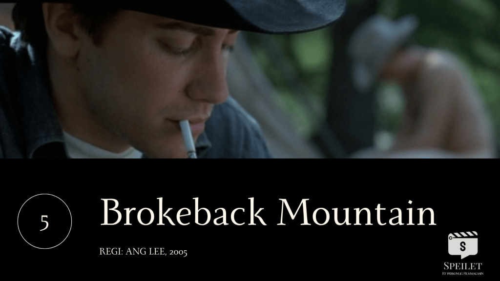 Ang Lee er en ujevn filmskaper. Men på sitt fremste er han nokså uovertruffen når det kommer til å skape lengselsfulle stemningsbilder og emosjonell poesi av møter mellom mennesker. I «Brokeback Mountain» blir naturen også en viktig størrelse – også som en metaforisk høyde de må bestige for å overvinne egne og ikke minst samfunnets oppfatninger og normer. Ledger spiller den kanskje psykologisk sterkeste rollen som den reserverte Ennis med innbitt fornektelse i møte med sin store forelskelse, Jack. I rollen som sistnevnte er likevel Jake Gyllenhaal fullstendig overbevisende med den styrken og oppriktigheten som utfyller dramaets vitale samspill. Kjemien er upåklagelig, og rollen som Jack i «Brokeback Mountain» førte til hans første Oscar-nominasjon (av totalt «bare» to, i skrivende stund).