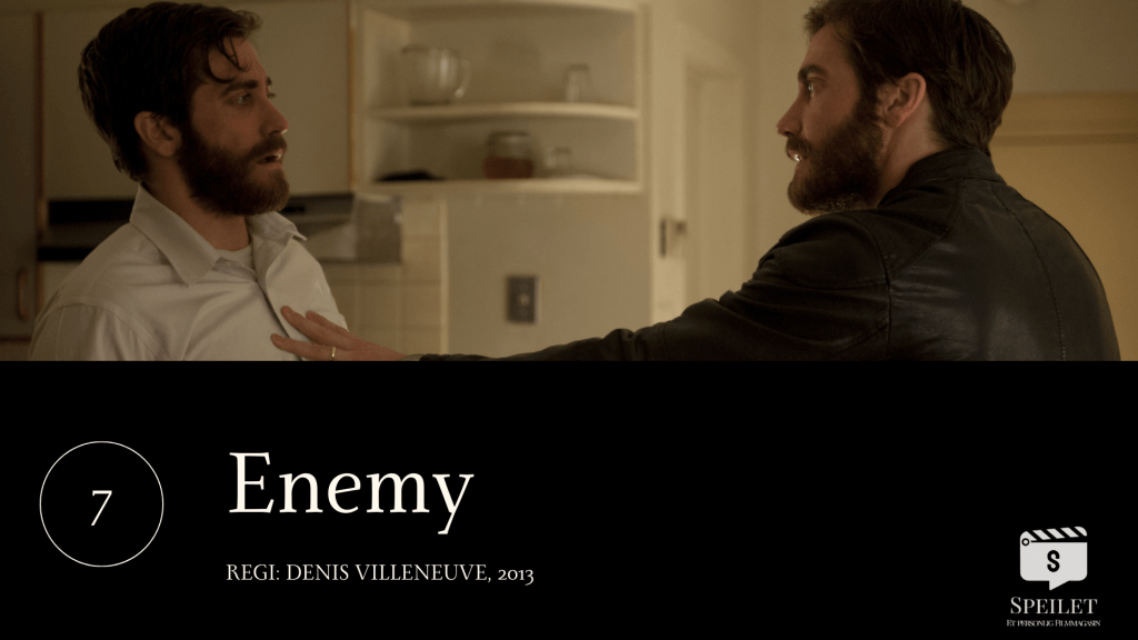 «Enemy» er et type kunstnerisk filmprosjekt som bør innby til spennende utfordringer som gode skuespillere kan forvalte til noe virkelig stort, det vil si én skuespiller i et portrett av to separate karakterer. Heldigvis for Villeneuve besitter Gyllenhaal det nivået når han går inn i den krevende dobbeltrollen som to fysisk identiske karakterer som står mot hverandre i en kompleks utforskning av menneskets underbevissthet. Det er kanskje Villeneuves lekne formspråk som trekker oss inn i filmens lille og forunderlige univers, men det er Jake Gyllenhaals subtile skuespiller-kvaliteter som holder oss inne i varmen.