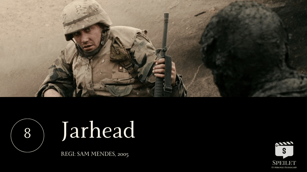 Det er en skildring av militær kjedsomhet under den første Gulf-krigen som har i seg åpenlyse referanser både til «Apokalypse nå» og «Full Metal Jacket». Men dette er også en krigsfilm uten krig, og mer en skildring av en sinnstilstand. Litt på samme måte som filmens publikum kan bli underveldet av krigsfilmens fravær av dramatikk, ser vi unge soldater kjede seg fordi krigsdeltakelsen deres lenge bare handler om å vente på noe som kan skje. «Jarhead» er ellers upåkeligelig castet – fra Jamie Foxx til Lucas Black, Peter Sarsgaard og ikke minst Jake Gyllenhaal. Sistnevnte spiller marinesoldaten «Swoff» som gradvis påvirkes av og uunngåelig absorberer krigens iboende galskap. Gradvis kommer det også til uttrykk i en atferdsendring, i en transformasjon som portretteres med ro og kontroll av Jake Gyllenhaal som akkurat i disse årene utviklet sin virkelige storhet som skuespiller.