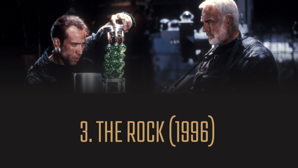 Selv om «The Rock» egentlig er på en hylle litt høyere enn «Con Air», føles det naturlig å trekke disse to forbløffende sterke Cage-actionforestillingene med ett års mellomrom sammen til å utgjøre en felles tredjeplass.