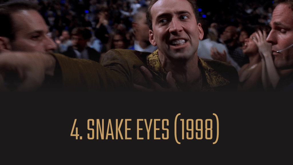 På det tidspunkt Brian De Palmas landet Nicolas Cage til hovedrollen «Snake Eyes», var han på høyden av karrieren som Hollywoods fremste actionskuespiller med «The Rock», «Con Air» og «Face/Off» like bak seg. Her glir han elegant inn i den fargesprakende skjorta som tilhører eksentriske Rick Santori, mens kamera kontinuerlig henger tett på ham – inkludert i en lang tagning i åpningen som er blitt av de mest ikoniske og berømte fra 90-tallet. Etter hvert som intensiteten i det klaustrofobiske og konspiratoriske thrillerdramaet trekkes opp, blir Cages flamboyanske og dominerende spill nøyaktig det drivstoffet De Palma trenger for å opprettholde det deilige energinivået og boblende filmkraften som driver «Snake Eyes» frem. I ettertid har Cage selv ofte snakket særlig varmt om denne filmen med forslag om at han mer enn gjerne returnerer som Rick Santoro ved en De Palma-regissert oppfølger.