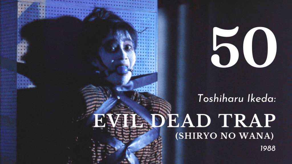 Ved å spole tilbake til 1988 befinner vi oss omtrent ti år før den asiatiske skrekkfilm-renessansen skapt av «Ringu», og Torshiharu Ikeda serverte «Evil Dead Trap» som et udiskutabelt mørkere, villere og mer brutalt stykke j-horror. Filmen virker, i positiv forstand, tungt europeisk inspirert med røtter fra Fulci/Argento. Scenene på den labyrintiske militærbasen, der det meste av handlingen foregår, er fotografisk badet i blått, mens atmosfæren som kommer ut av det både er feberdrøm-aktig og brutal på samme tid. Filmen er ingen prøvelse verken for intellekt eller tålmodighet, men pøser på med en strøm av morbide iscenesettelser av vold som, heldigvis, ikke presenteres uten filmatisk eleganse. «Evil Dead Trap» er pakket inn i et prangende uttrykk av redsel, frykt og perversitet – men bak denne innpakningen skjules også velskapte kulisser og inspirert kameraarbeid. Bak alt det lugubre, er det en lukt av et gjennomført filmarbeid her som faktisk evner å kanalisere ektefølte øyeblikk av suspense og nysgjerrighet for hvilken retning plottet til slutt tar. Det finnes ikke et kjedelig eller intetsigende sekund her.