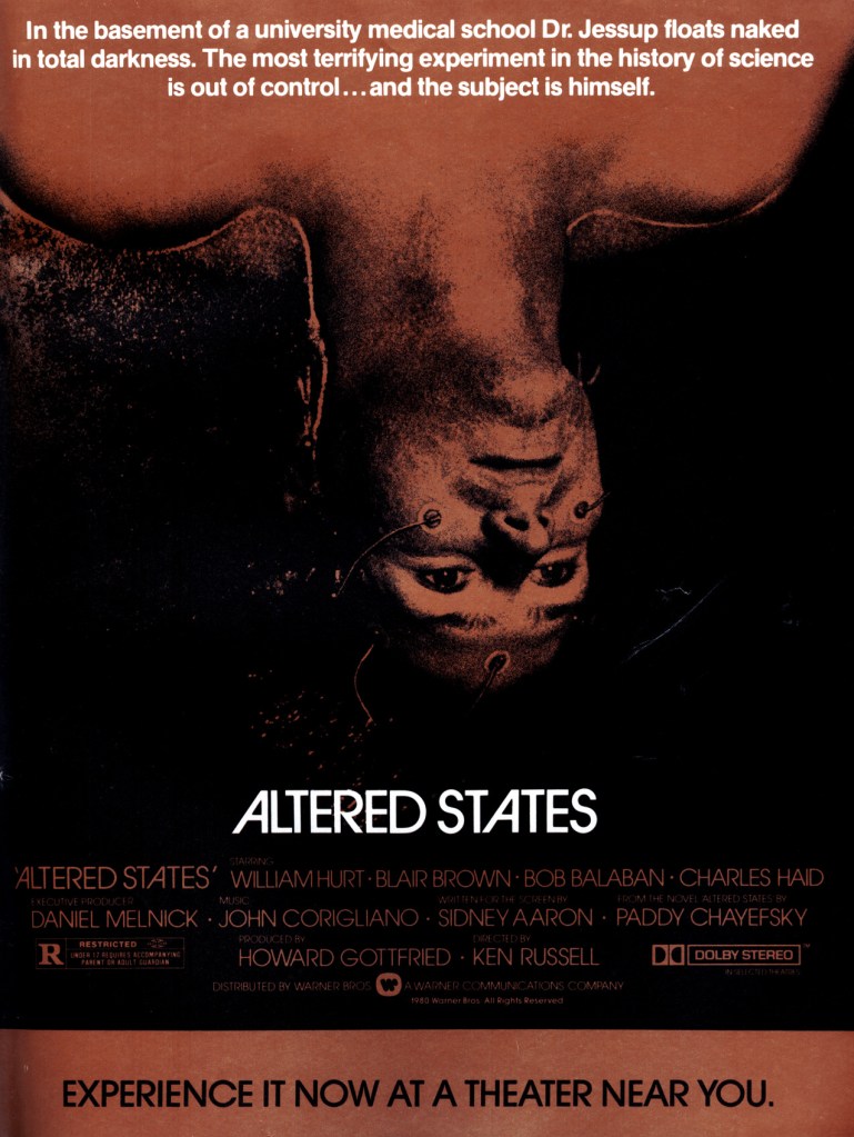 «Russell introduserer en debuterende William Hurt i hovedrollen; en vitenskapsmann som gjør seg selv til forsøkskanin i et hallusinasjons-eksperiment, som for seerne utvikles til en grafisk og tematisk mindfuck-reise.»