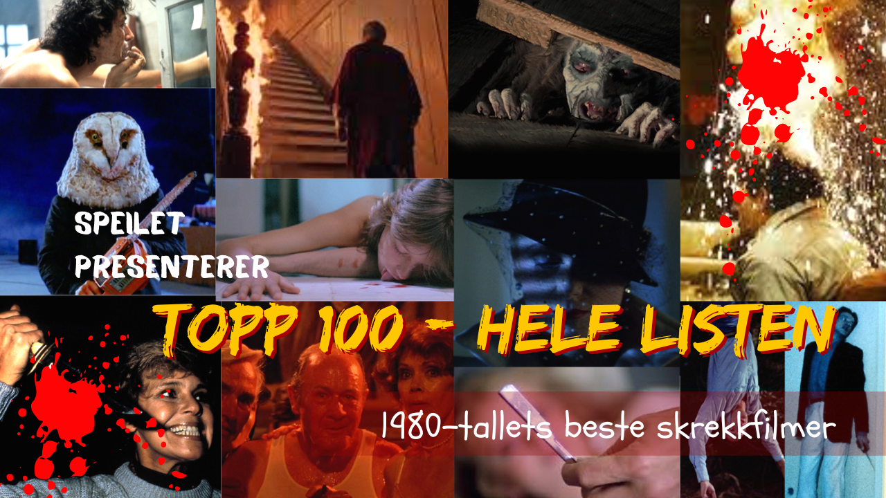 Gjennom vinteren 2023/2024 har Speilet gradvis telt ned det som subjektivt er vurdert som de hundre beste skrekkfilmene fra 1980-tallet. Det har foregått gjennom ti artikler hvor ti filmer har blitt presentert pr. gang med nedtelling fra 100 til 1. I denne saken er alle filmene samlet til én liste med et kort utdrag hentet ut fra de enkelte omtalene.