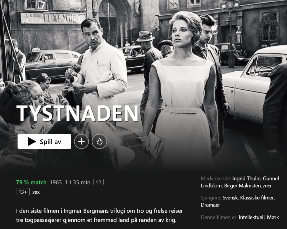 Netflix har et relativt rikt utvalg av Ingmar Bergman-oppføringer i katalogen. Blant annet gir strømmegiganten deg muligheten til å se noen av hans aller mest kjente og bejublede verk som fantastiske Jordbærstedet, Persona og Fanny og Alexander. Men like essensielt er det å begi seg ut på den tematiske trilogien som Bergman formulerte tidlig på 1960-tallet, via Såsom i en spegel (som også finnes på Netflix!) via Nattvardsgästerna) og frem til Tystnaden. Det som binder filmene sammen er at de på ulik måte er kammerdramaer som utforsker tro og fremmedgjøring i en kontekst av datidens nåtid. Filmene kan uansett ses fullstendig uavhengig av hverandre. Når det kommer til Tystnaden, er det definitivt at Bergmans mest sensuelle og estetiserte verk på overflaten, mens det under overflaten er et tenkende og ubehagelig menneskelig drama om eksistensialisme og isolasjon. Tystnaden er like tung som den er vakker, men berikende og en essensiell bit av den store Bergman-kaka.