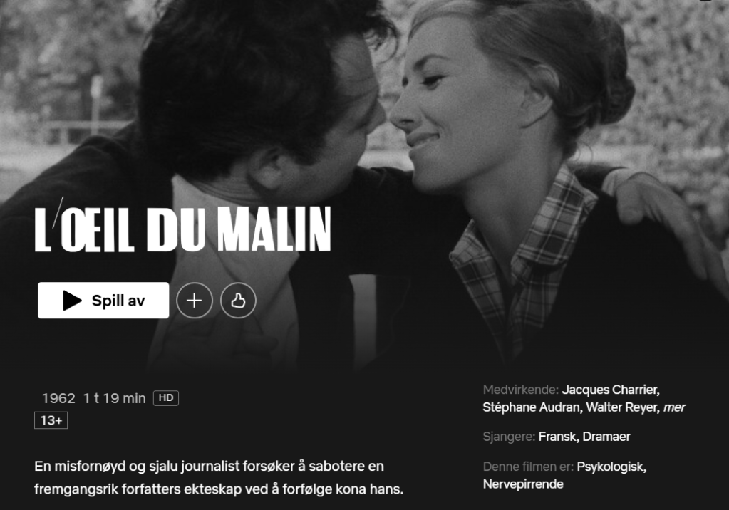 Den produktive franske nybølge-aktøren Claude Chabrol er representert med flere filmer på Netflix. Én av disse er hans sjette spillefilm, men fortsatt tidlig i karrieren og før gjennombruddet som først skulle komme noen få år senere. «L’oeil du malin» er imidlertid særlig interessant som en bro mellom den tidlige eksperimentelle stilen og den særegne psykologiske thriller-varianten han perfeksjonerte i nærheten av 1970. Her er elementer av Hitchcock ispedd det som senere skulle bli Chabrol selv, men iført en annen form for stilistisk øvelse. Det er en kald og kontrollert film, men også et fengslende mysterium, som kretser om både person, geografi og handling. Det er en film som lar hovedpersonens tanker vandre fra bildene til seeren som monologer spredt utover nøye studerte bilder. Det er kanskje ikke et fullendt filmstykke, men det er en veldig interessant bit som er saftfull alene, og enda mer som en spennende aperitiff på det som senere skulle komme fra samme mann.