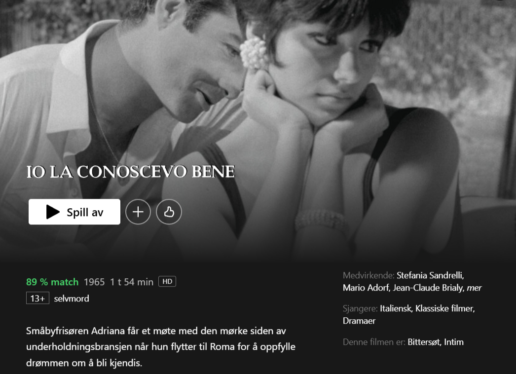 Dette er et litt bortgjemt mesterverk (til tross for at den er innlemmet i The Criterion Collection, vel og merke). Kanskje mer kjent under den engelskspråklige tittelen, «I Knew Her Well», er dette både en trist og vakker film i regi av Antonio Pietrangeli. I hovedrollen er Stefania Sandrelli (fra Bertoluccis «The Conformist») fantastisk i den bærende hovedrollen; en kvinne som ankommer Roma med håp i blikket om å bli stjerneskuespiller, men som blir mentalt tygd og spyttet ut av omgivelsene som ubrukelig. Pietrangeli viser henne så ofte han kan frem for den vakkerheten hun har i seg, og som ofte speiles i de tilsvarende vakre stedene rundt filmens handling. Men samtidig er det også klare fragmenter av den neorealistiske arven i iscenesettelsene som påminner oss om at vi er nærmere en vondere virkelighet. Derfor skiller også «I Knew Her Well» seg noe fra den mer flamboyante Federico Fellini og hans ikoniske «La Dolce Vita», som denne kan bli sett på som en spirituell søskenfilm av. «I Knew Her Well» har en herlig rytme i foto, klipp og musikk. Den er preget av tiden, men også frisk med klar modernitet i seg. Pietrangeli har i det hele tatt lykkes i å kombinere det vakre med det såre, det realistiske med det fortryllende i en film som dermed både blir elegant og trist. Til slutt er dette virkelig i toppsjiktet av italiensk film fra 1960-årene, og det sier ikke så rent lite om dens kvaliteter.