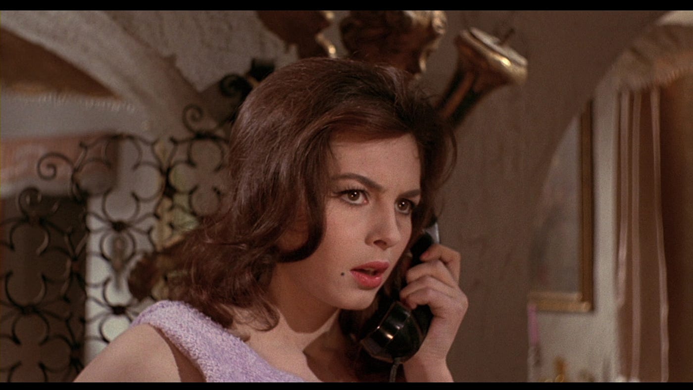 «Black Sabbath» består altså av tre kortfilmer, og de har en varighet på omtrent en halvtime hver. Den første (rekkefølgen kan variere noe ut fra diverse utgivelser), «The Telephone», utspiller seg som en mild og tidlig giallo, hvor ei vakker og ung kvinne blir terrorisert av en truende mann i andre enden av telefonrøret. På én måte er det klassisk orkestrert skrekk, men av den tålmodige og stilsikre sorten. Bavas komposisjon har i dette segmentet en særlig malerisk kvalitet i seg. Med forsterket bruk av farger tilføres masse tekstur til bildene, mens Bavas avventende fortellerteknikk bygger opp en nervøsitet og spenning som kjennes på kroppen ved å holde på farlighetene som noe fremmed, men likevel nært. Måten Bava iscenesetter den konseptuelle ideen, med blikkfanget som er den røde telefonen og dens truende lyd, er det nettopp det enkle og virkningsfulle premisset som gjør denne første halvtimen av «Black Sabbath» til helhetens aller mest fokuserte og spennende. Det er vakkert, forlokkende og farlig i en presentasjon som altså har noen giallo light-vibber, og som gir oss en praktfull Michèle Mercier i hovedrollen som den terroriserte Rosy.