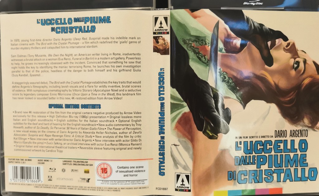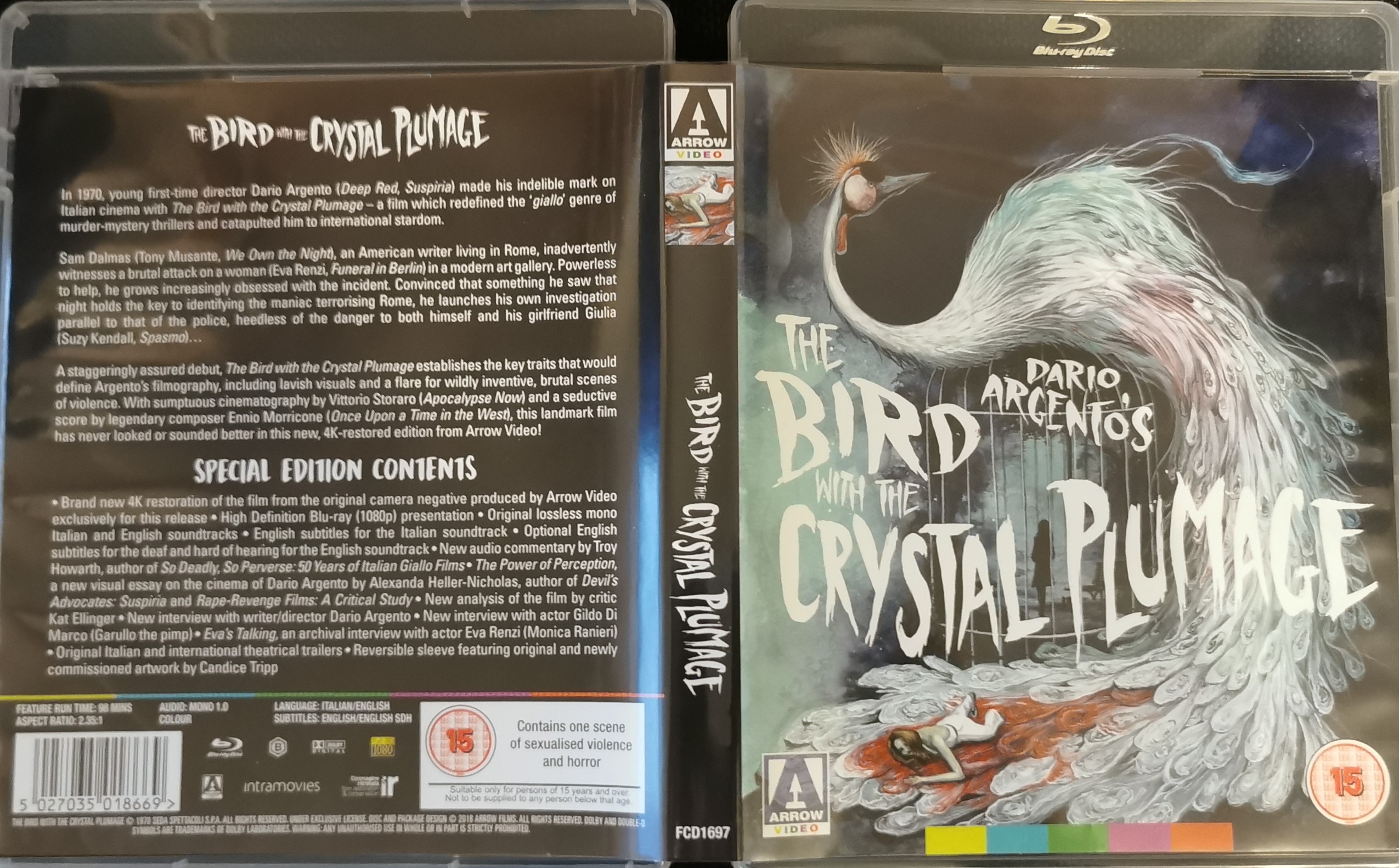 «The Bird with the Crystal Plumage» har blitt utgitt en rekke ganger på fysisk format. Fra tidligere har jeg lenge hatt i eierskap to ulike Dario Argento-samlebokser; den ene en eldre, svenskutgitt DVD-boks, og den andre en nordisk blu-ray-samling med de seks filmene som mest typisk trekkes frem som hans beste/viktigste. Men selvsagt finnes det mange selvstendige utgivelser av de viktigste Argento-titlene, og det har føltes riktig og viktig å supplere samlingen med en del av disse. Ikke minst fordi en distributør som Arrow Films har stått for en samvittighetsfull og forseggjort forvaltning av Argento-arven på fysisk format. Det er utgivelser som ser fine ut, og som gjerne tilbyr eksklusivt innhold i form ekstramateriale som kan gi kontekstuell merverdi for oss som er særlig begeistret for den italienske sjangermesterens ouvre.