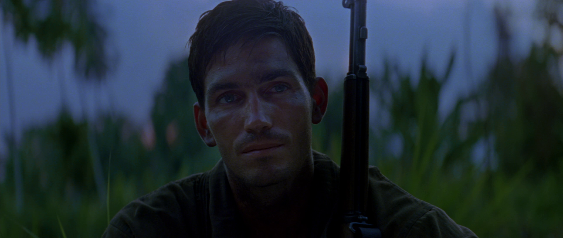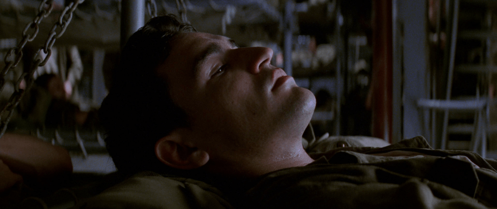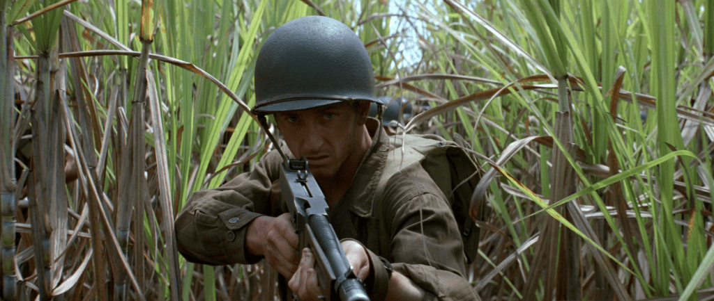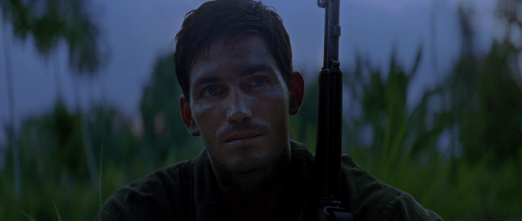 Det er en klar kontrast til «Saving Private Ryan» allerede i begynnelsen, selv om det ytre har påfallende likheter. I begge tilfeller ankommer soldater en strand i dødsangst for hva som kan vente dem. Her er Omaha Beach byttet ut med Guadalcanal. Vi er i hjertet av Stillehavet hvor amerikanske styrker går i land for å kjempe mot den japanske fienden. Men det som venter soldatene, og oss som kinopublikum, treffer ikke like hardt og umiddelbart som det gjorde i Normandie. I Spielbergs film venter et krigersk inferno ved strandlandingen som umiddelbart gir av filmhistoriens mest brutale og realistiske krigskampsekvenser. Det er ristende, håndholdt kamera som vasser i skitt, blod og død med gritty realisme for å tvinge oss ubehagelig tett på den redselsfulle virkeligheten. «The Thin Red Line» er heller ikke urealistisk når den viser hvordan krig også er venting og desorientering. Men i påvente av voldsomhetene i de ytre krigskonfrontasjonene, kan Malick bruke tid på å nærme seg soldatenes indre konflikter samtidig som han projiserer ideer i et kosmisk rammeverk. For i en løs narrativ struktur, kan Malick la kamera flyte fritt over natur og mennesker som med indre monolog blottlegger egne følelser. Da innser vi at det brede lerretet snart skal fylles med et uendelig antall brikker i et puslespill som transcenderer krig og vår fysiske verden. Derfor kan «The Thin Red Line» også tillate seg å være så poetisk, drømmende og meditasjonspreget som den er. Og det er helt fantastisk.