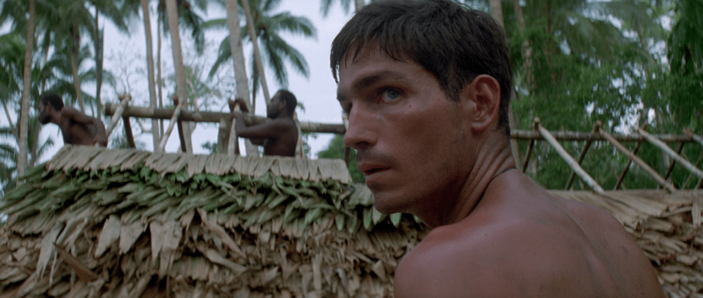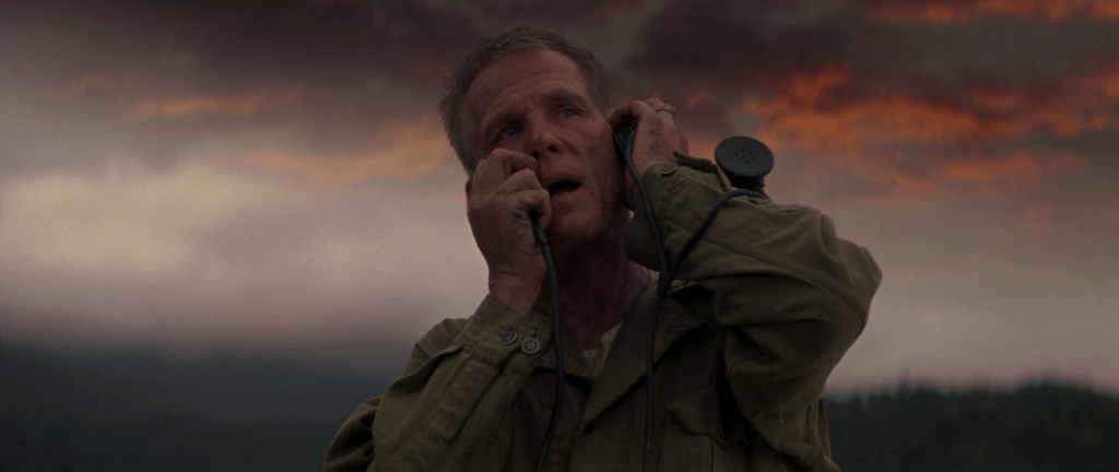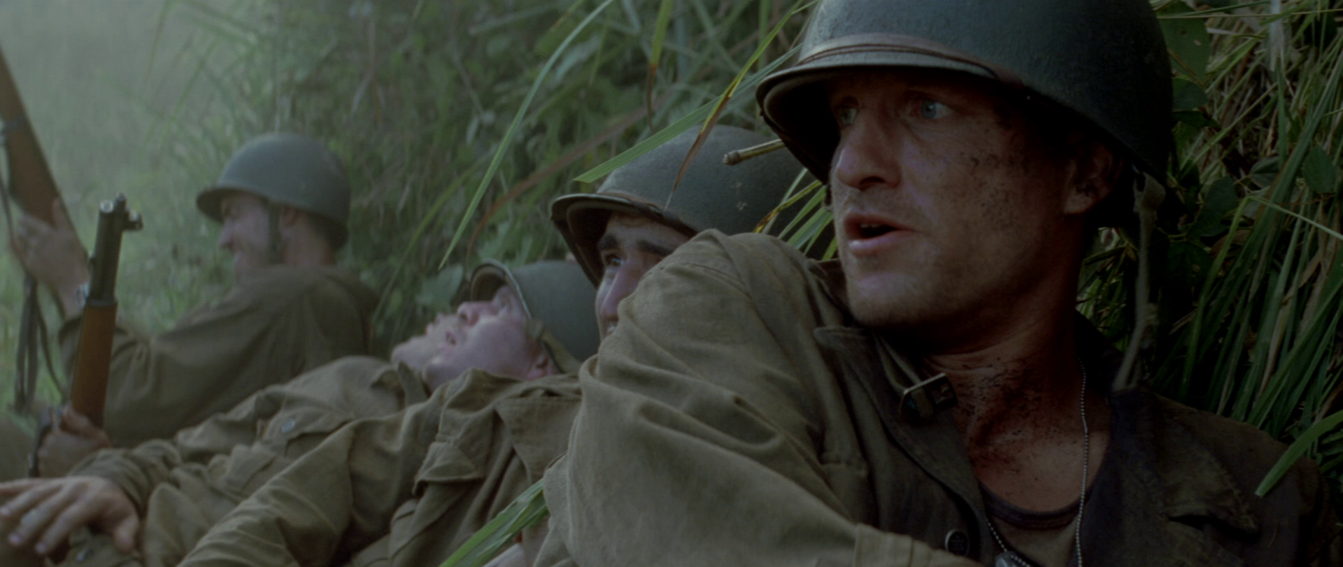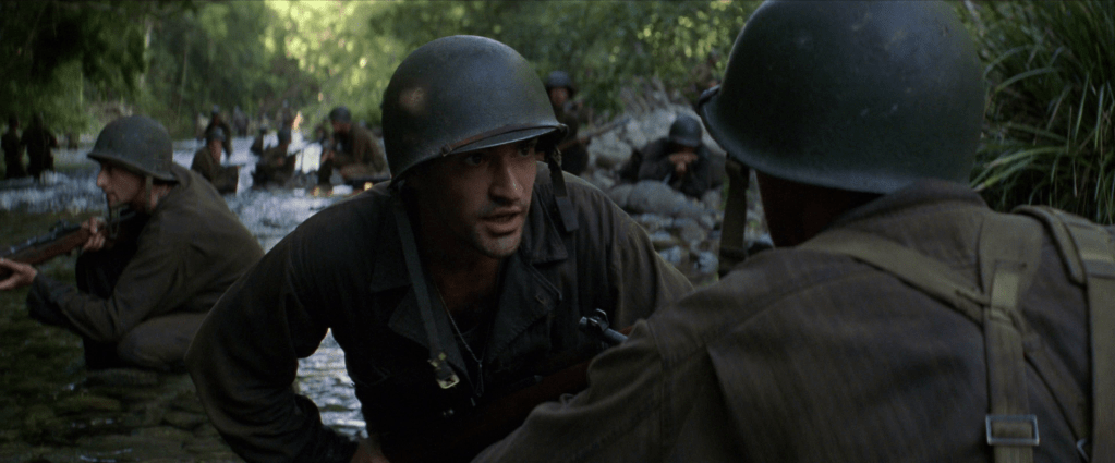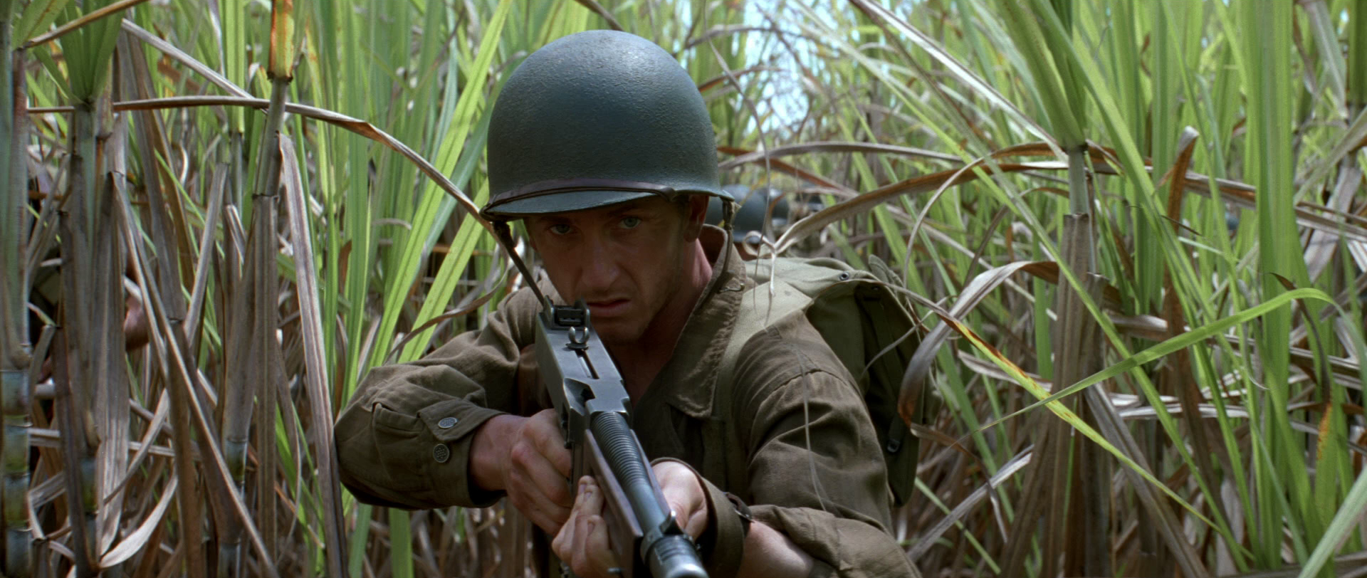 Det er en klar kontrast til «Saving Private Ryan» allerede i begynnelsen, selv om det ytre har påfallende likheter. I begge tilfeller ankommer soldater en strand i dødsangst for hva som kan vente dem. Her er Omaha Beach byttet ut med Guadalcanal. Vi er i hjertet av Stillehavet hvor amerikanske styrker går i land for å kjempe mot den japanske fienden. Men det som venter soldatene, og oss som kinopublikum, treffer ikke like hardt og umiddelbart som det gjorde i Normandie. I Spielbergs film venter et krigersk inferno ved strandlandingen som umiddelbart gir av filmhistoriens mest brutale og realistiske krigskampsekvenser. Det er ristende, håndholdt kamera som vasser i skitt, blod og død med gritty realisme for å tvinge oss ubehagelig tett på den redselsfulle virkeligheten. «The Thin Red Line» er heller ikke urealistisk når den viser hvordan krig også er venting og desorientering. Men i påvente av voldsomhetene i de ytre krigskonfrontasjonene, kan Malick bruke tid på å nærme seg soldatenes indre konflikter samtidig som han projiserer ideer i et kosmisk rammeverk. For i en løs narrativ struktur, kan Malick la kamera flyte fritt over natur og mennesker som med indre monolog blottlegger egne følelser. Da innser vi at det brede lerretet snart skal fylles med et uendelig antall brikker i et puslespill som transcenderer krig og vår fysiske verden. Derfor kan «The Thin Red Line» også tillate seg å være så poetisk, drømmende og meditasjonspreget som den er. Og det er helt fantastisk.