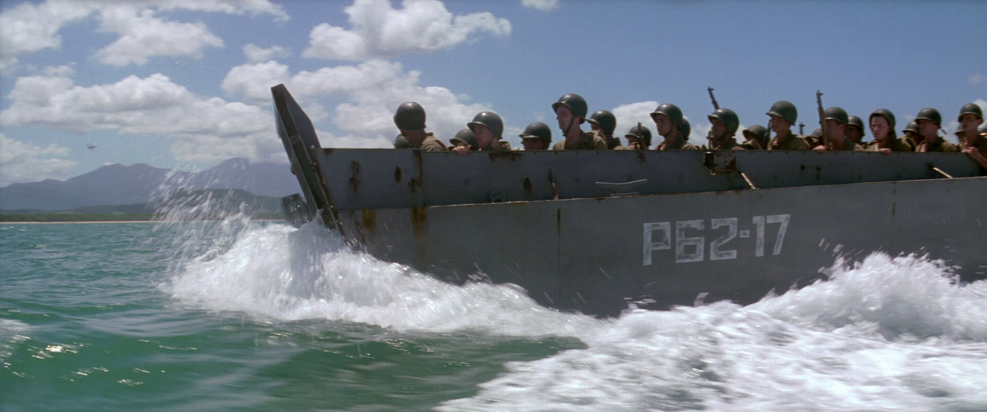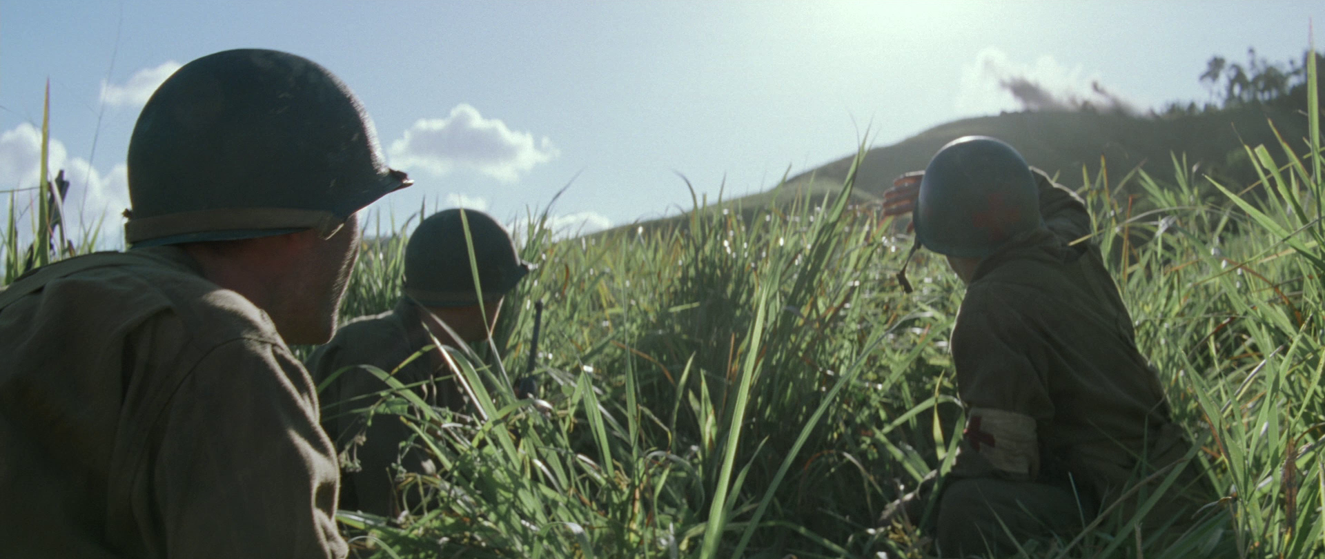Samtidig som «The Thin Red Line» er fragmentarisk og meditativt anlagt ved å søke seg sterkere mot ideer og stemninger enn handling, føles det underkommunisert at filmen samtidig rommer noen usedvanlig spennende iscenesettelser. Det blir først og best illustrert i den tidlige sekvensen hvor soldatene har ankommet øya og må krype usett i gresset på vei mot åsen der de japanske styrkene venter. Her viser Malick at han også mestrer kunsten å forme genuint spennende øyeblikk med sitt karakteristiske, poetiserende formuttrykk. Det er sjeldent raske klipp i «The Thin Red Line», men en klippestil som ofte virker flytende og assosiativ. Det gjelder også for oppbygningen til konfrontasjonene på slagmarken. Kamera er typisk observerende og lavtførende like over det halvhøye gresset. Den nervøse svetten, pusten og blikkene treffer oss derfor dypere. Malick evner å forene åndelig og fysisk spenning med intense nærbilder av uro til suggererende effekt, mens Hans Zimmers tidvis sakrale musikk smelter inn for å løfte inntrykkene til noe transcendalt. Tonene er like vakre som de kan virke skremmende. Det er lange og svevende melodilinjer av minimalistiske gjentagelser. Det gir også et sterkt bilde på Zimmers allsidighet som filmkomponist hvor han aldri henfaller til heroisk musikk – som han fra actionsjangeren har demonstrert evne til å perfeksjonere – men tilpasser seg ved å legge nye og utvidende lag på Malicks materiale som gir det et tydelig emosjonelt løft.
