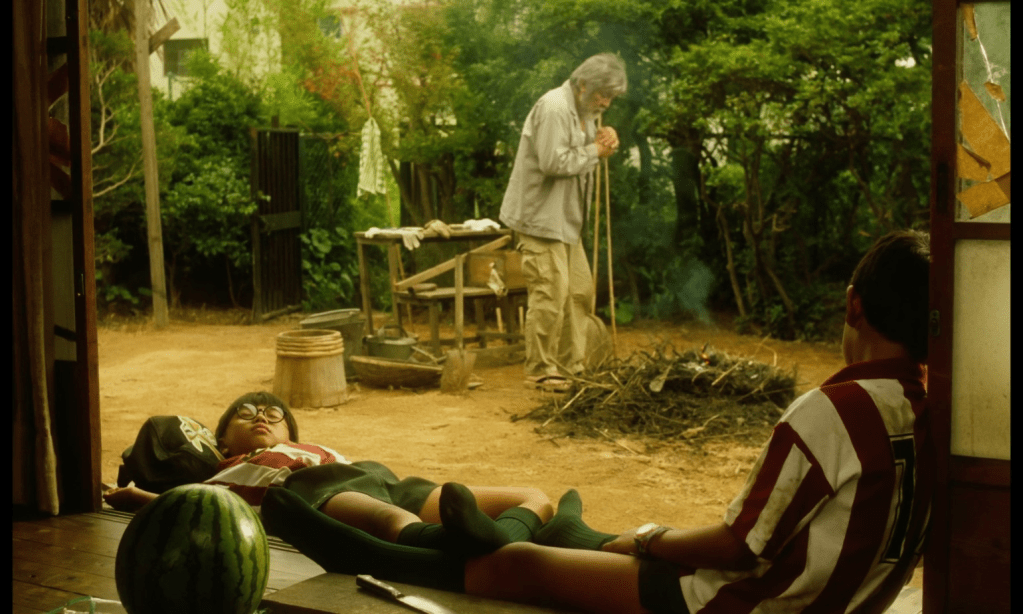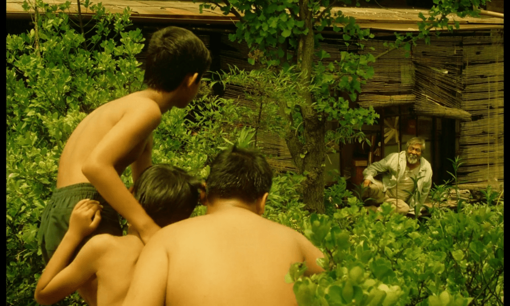 I The Friends skildres de emosjonelle overgangene ofte uten ord, og døden – filmens stille omdreiningspunkt – berøres med samme varsomhet. Den gamle mannen som guttene holder vakt over, blir aldri forklart eller utredet, men tilstedeværelsen gir rom for kontemplasjon, både for barna og for seeren. Og fremfor å dramatisere tapet, lar Somai oss erfare det som en del av verdens rytme. Der Typhoon Club brukte stormen som symbolsk uttrykk for tenåringsopprør, er tyfonen i The Friends mer lavmælt som et tegn på at noe er i endring.